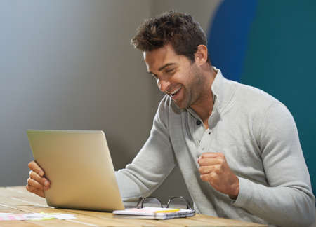 Celebrating a successful startup. A smiling entrepreneur using his laptop at a table.