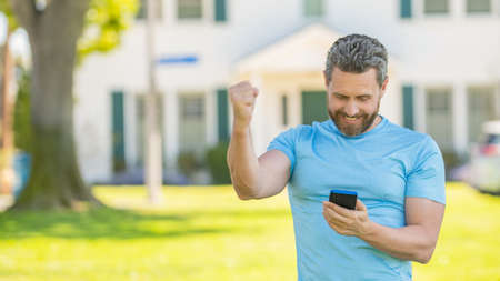 happy unshaven guy celebrating success reading good news on smartphone, copy space, happiness