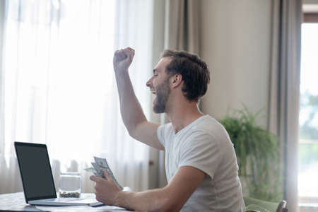 Happy person getting bonus money and banknotes flying in the air and get lucky rich and financial freedom comeliness