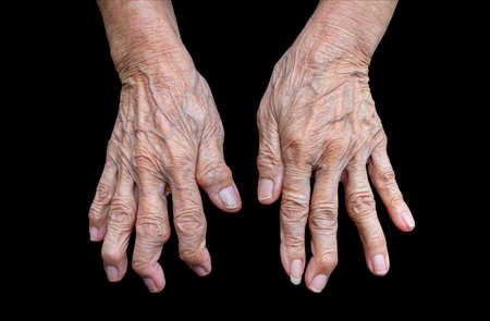 The hands of the elderly women have curly fingers and wrinkled on black background skin with clipping path.