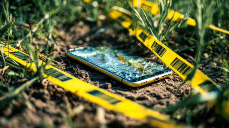 A shattered mobile device lies abandoned in an open field, cordoned off with bright yellow tape, hinting at an unresolved mystery or possible theft scene.
