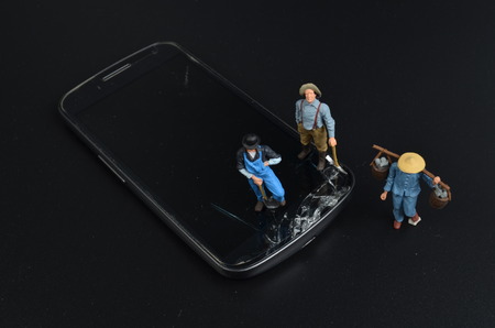 Miniature people. Business men stand near disassembled parts of an electronic device. Business entrepreneur concept