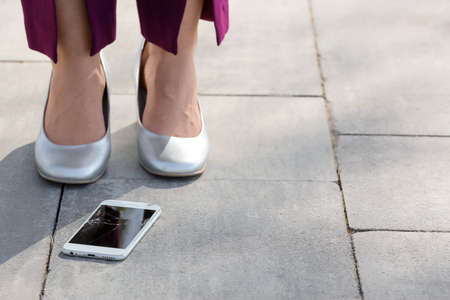 Legs of woman in heels and damaged mobile phone on pavement outdoors, closeup