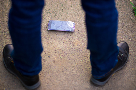 Broken screen mobile phone lies on ground