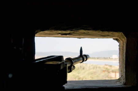Tourist site. Battery de Castillitos in Spain Cartagena, Cabo Tinoso. Military cannon for coast defense, naval gun batteries. Guns of Mazarron.