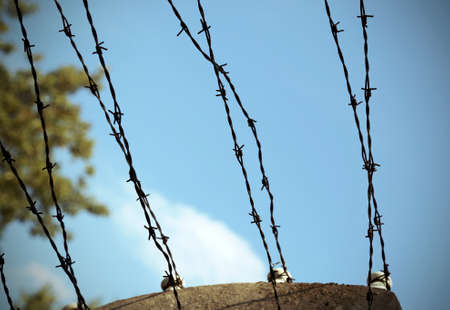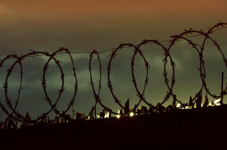 Prison security fence. Barbed wire security fence. Razor wire jail fence. Barrier border. Boundary security wall. Prison for arrest criminals or terrorists. Private area. Military zone concept.