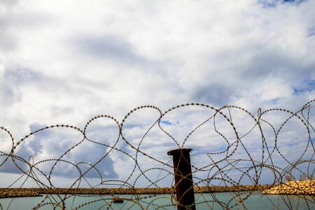 Razor wire fence in daylight view. International boarder between two countries.