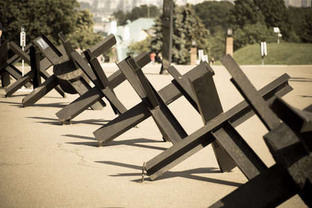 Military anti-tank czech hedgehogs on river bank. Metallic barricade or obstacle for defense. War in Ukraine 2022. Russian aggression