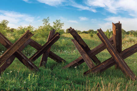 Rusty anti-tank hedgehogs on the wet grass on sunset background. War in Ukraine