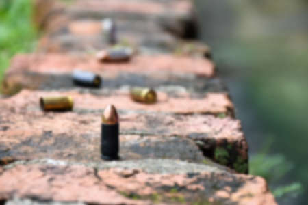 9mm pistol bullets and shells on brick floor, soft and selective focus, concept for searching a key piece of evidence in a murder case at the scene.