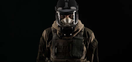 a man in a military uniform and a gas mask holds with an angry expression of emotions on a black background