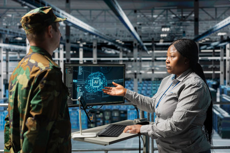 Army tech expert in data center relaying AI battlefield analysis to commanding officer. Server farm workers discussing threat detection results powered by artificial intelligence