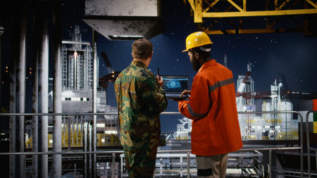 Naval soldier and african american engineer coordinating protection and logistics for offshore oil rig, ensuring safety, intelligence readiness and maritime defense operations at sea.