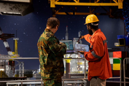 Offshore engineer and naval officer using AI technology on laptop to inspect drilling operations, working with the coastal command post to ensure safe oil extraction activity.