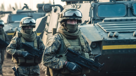 Soldier in military uniform and helmet near cargo containers, representing defense, transport security, and logistics.