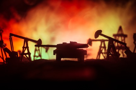 Artwork decoration. Oil war concept. Military silhouettes at oilfield with pumps and rigs. Misty colorful sky background. Armored vehicles fighting scene. Selective focus