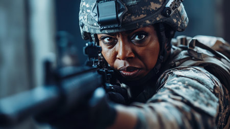 A determined soldier aims his rifle in a tense urban combat scenario, showcasing precision, focus, and military readiness in a city environment.