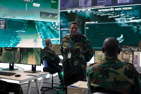 Diverse special operation engineers examine real time information on a big screen, collecting intelligence to aid troopers during military operations. IT professionals work on reconnaissance.