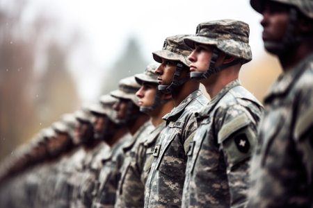 A group of soldiers, united and ready, stand in a commanding line formation, US soldiers standing in formation on a ceremony, top section cropped, AI Generated