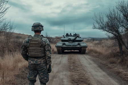 A solemn young man in military attire stands before tanks at dusk, embodying strength and duty. A.I.