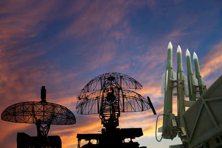 Air defense radars of military mobile anti aircraft systems and modern Russian anti-aircraft missiles OSA-AKM on the background of the sunset orange sky,Russia