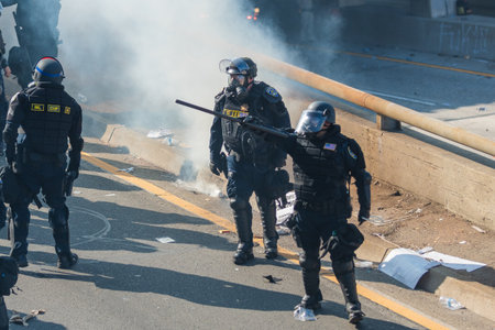 Los Angeles, USA – June 8, 2025: Riot police officer pointing baton at protesters during a downtown demonstration against expanded ICE operations and in support of immigrant rights
