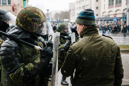 Back turned view team riot police managing a fierce demonstration.