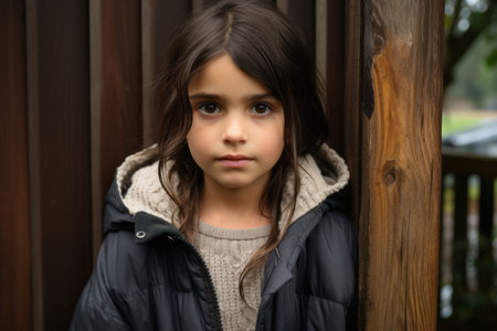 a young girl standing in front of a wooden fence