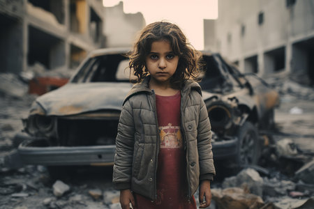 a young girl stands in front of a destroyed car