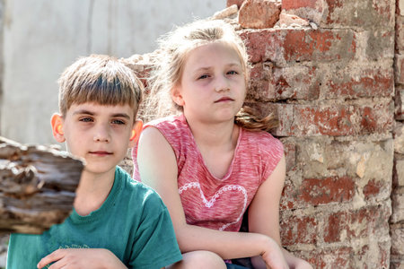 Poor orphans against the background of destroyed buildings, the concept of the life of street children.