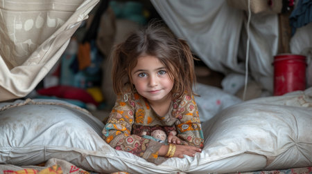 A little girl plays with dolls in a makeshift hut made of pillows and blankets.