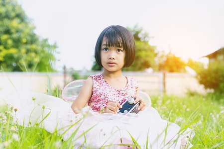 Cute little happy girl with vintage photo camera outdoors