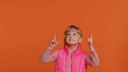 Toddler children girl showing thumbs up, pointing up empty place, advertising area for commercial text, copy space for goods promotion. Young one little child kid isolated on orange studio background