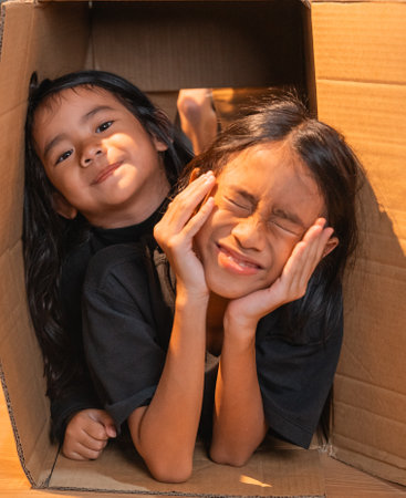 Two playful children having fun in a cardboard box, showcasing joy and creativity.