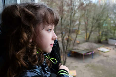pretty girl looks out window at an empty street, a playground. Close-up portrait. Copy space