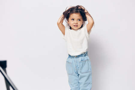 funny, cute, little girl stands in a white T-shirt on a light background and raises her hair on her head up