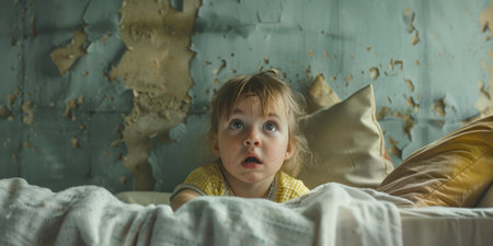 surprised kid in bedroom. child's eyes widened in amazing. copy space for your text