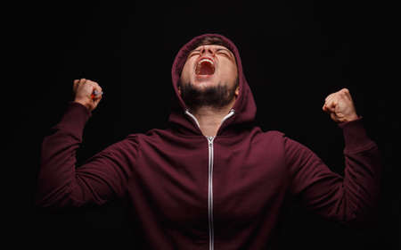 Screaming, sick male on a black background. Stressed student in a hoodie. Man suffering in pain. Anger issues concept.