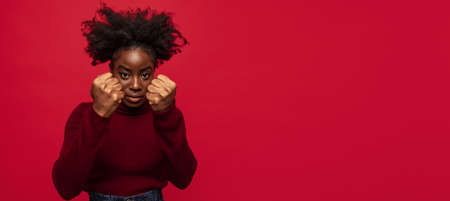 Displeased African young girl showing her fists as symbol of protection from violence isolated on dark red background.