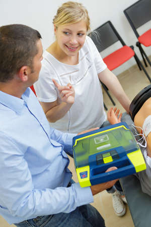 The medical team is practicing saving lives with models and using machines. defibrillator To save lives