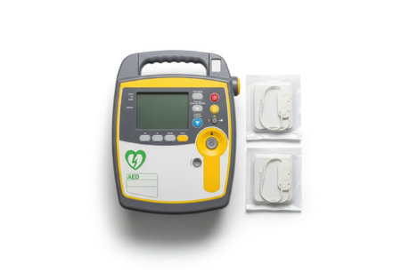 A compact and portable Automated External Defibrillator (AED) device shown with its accompanying electrode pads. Essential for immediate response to sudden cardiac arrest incidents, providing life-saving electrical shock therapy.