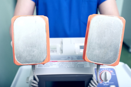 Selective focus at defibrillator while doctor use it to pump at chest of unconscious with low heart rate patient to save life while doing medical surgery inside of operating room. Emergency aid, CPR.