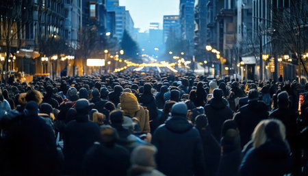 A vibrant urban scene captures a large crowd of people walking during sunset, creating long shadows on city streets. The dynamic atmosphere reflects the energy of daily life.