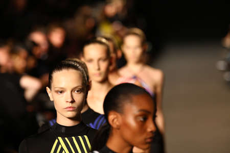 Zagreb, Croatia - October 24, 2019 : A model wearing Klisab fashion collection on the catwalk at the Bipa Fashion.hr fashion show in Zagreb, Croatia.