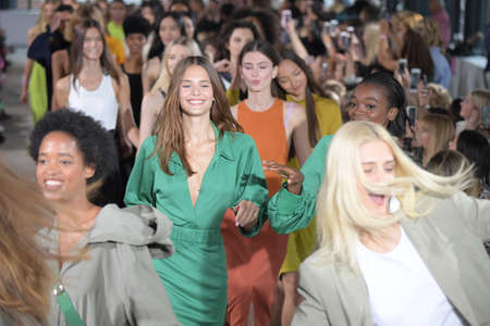 Female models walk the runway in different dresses during a Fashion Show. Fashion catwalk event showing new collection of clothes. In a row.