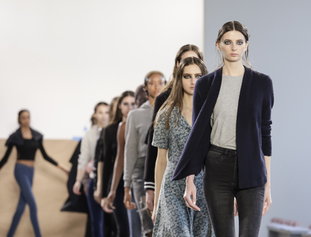 NEW YORK, NY - FEBRUARY 19: Models lineup backstage at the New York Life fashion show during MBFW Fall 2015 at Lincoln Center on February 19, 2015 in NYC.