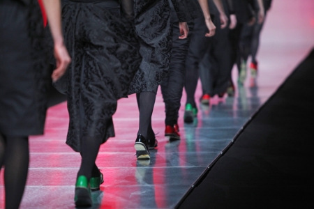 Female models walk the runway in different dresses during a Fashion Show. Fashion catwalk event showing new collection of clothes. Legs and shoes only.