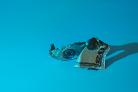 Rumpled money lies on a blue background. Two crumpled hundred dollar bills. Side view from an angle. Selective focus. Copy space.