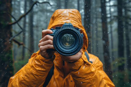 A close-up of a photographer wearing a yellow jacket, holding a camera, with dramatic lighting and a dark background.