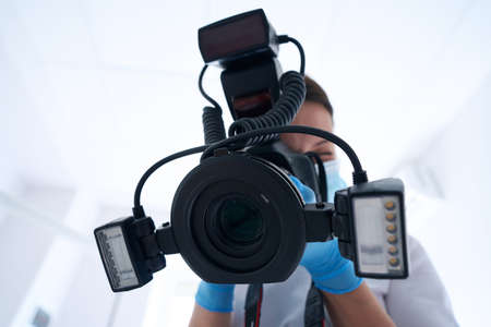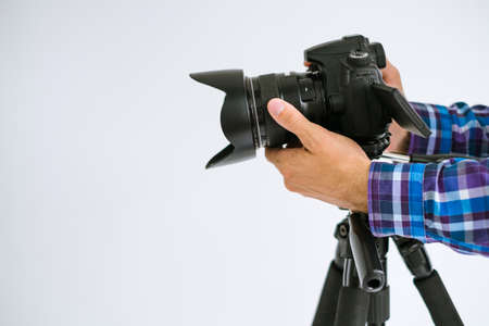 Photo camera in the hands of a man professional equipment hobby Creative approach studio cropped view